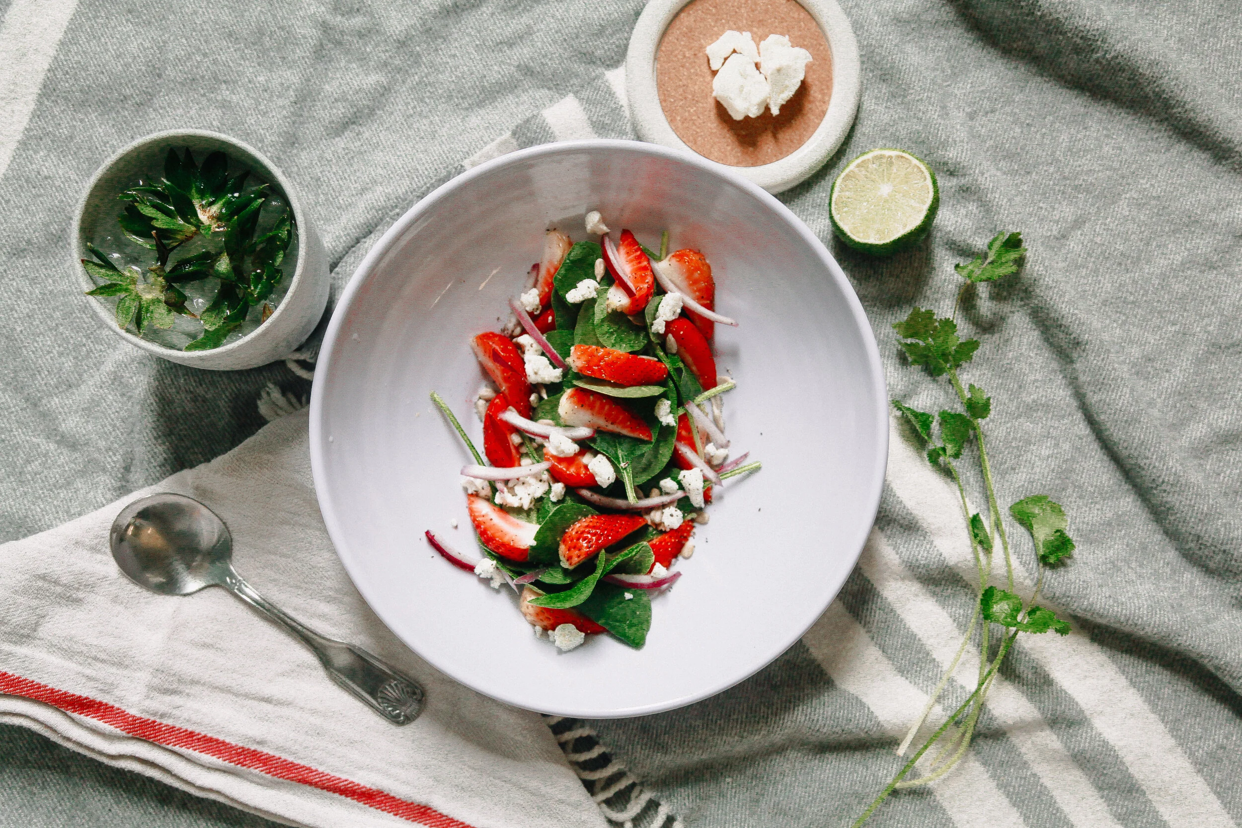 This salad starts my story in Los Angeles. It is hot, a little humid and I noticed that for the past 4 days I don’t want to eat heavy meals. Maybe meat comes later but now let’s check out this fresh and crunchy strawberry salad with goat cheese, spinach, red onion and a bunch of other healthy stuff.